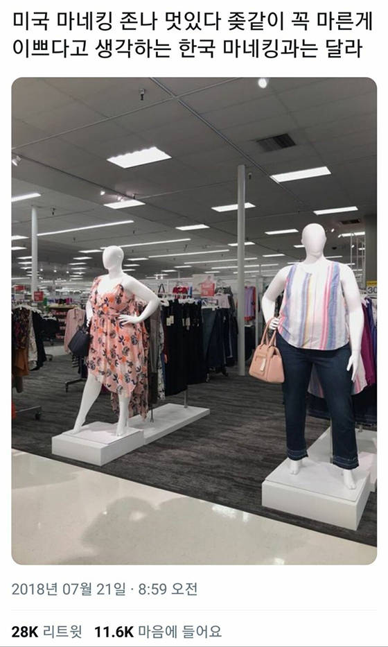 게시자는 이 사진과 함께 '미국 마네킹 X나 멋있다. 꼭 마른게 이쁘다고 생각하는 한국 마네킹과는 다르다' 라고 설명했다.