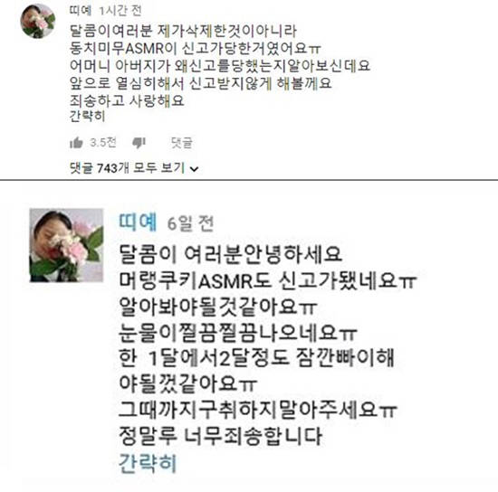 유튜버 '띠예'는 ASMR 먹방으로 단기간에 구독자 50만을 보유한 초등학생 유튜버로 '머랭 쿠키', '식욕 색종이', '바다 포도' 등의 ASMR 먹방으로 모두 조회 수 100만을 넘을 정도로 많은 사랑을 받고 있다. 그러나 최근 그의 영상들이 하나둘씩 삭제가 돼 논란이 됐다. 이에 '띠예'는 "달콤이 여러분 제가 삭제한 것이 아니라 동치미 무 ASMR이 신고 당한 거였어요"라며 "어머니 아버지가 왜 신고를 당했는지 알아보신대요"라고 글을 올렸다.