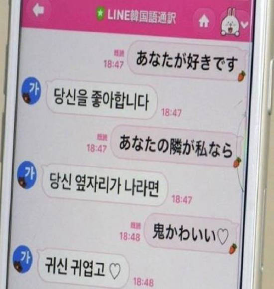 또한 비밀 연애를 하고 있었다는 사용자는 "얼마 전 아버지가 옆에서 TV를 보고 있을 때 남자친구에게 '귀신 귀엽다'라는 한국어 메시지가 와서 위험했다"라고 말했다. 이어 "'귀신 귀엽다'를 일본어로 돼 바꾸면 '진짜 귀여워'로 해석되기 때문이다"라며 "이 메시지를 본 뒤 너무 기뻐 자신의 방으로 도망쳤다"라고 덧붙였다.