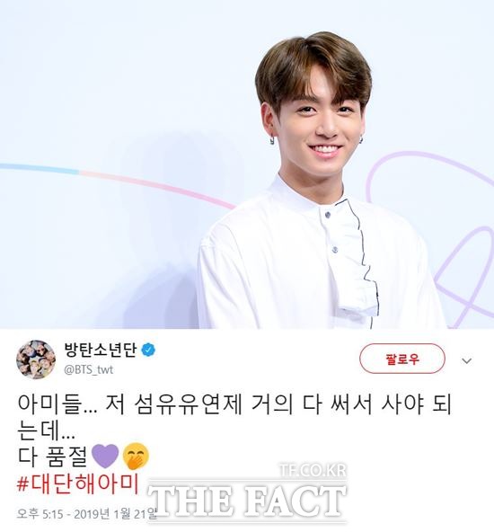 이튿날 정국은 방탄소년단 공식 트위터 계정에 글을 올리고 "아미(방탄소년단 팬클럽)들 저 섬유 유연제 거의 다 써서 사야 하는데, 다 품절"이라고 말했고, '대단해 아미'라는 해시태그를 덧붙였다.