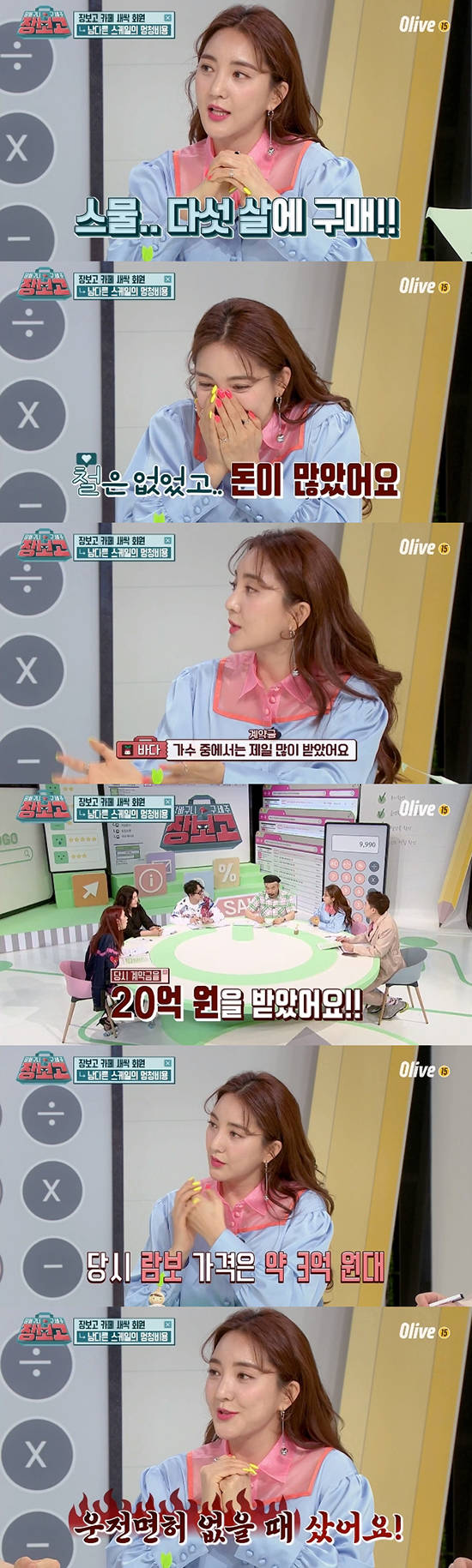 23일 Olive·tvN '장보고'에 바다가 특별 게스트로 출연해 자신의 에피소드를 공개했다. 이날 방송에서 바다는 쓸데없이 돈이 새 나간다는 이른바 '멍청 비용'에 대해 이야기하던 중 자신의 가장 후회되는 구매 아이템으로 람보르기니를 꼽았다.