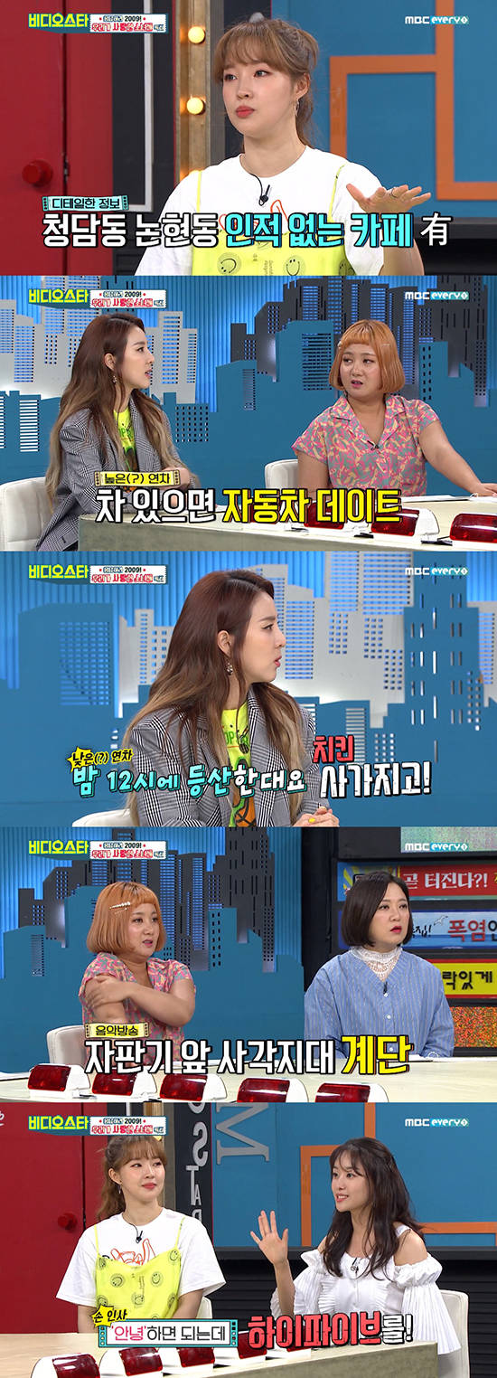 전지윤은 "사람이 없는 카페가 있다. 청담동, 논현동 쪽에 사람이 없는 곳이 있다"면서 아이돌 연애의 성지 같은 곳이라고 대답했다. 산다라박은 "데뷔 연차별 데이트 장소도 달라진다"며 "차 있는 사람이 생기면, 차 안에서 데이트를 하기 시작한다. 나중에 독립하면 집 데이트를 한다"고 밝혔다. 이어 산다라박은 "데뷔 연차가 낮은 친구들은 밤에 치킨을 사서 등산을 하기도 한다"고 설명해 웃음을 자아냈다.