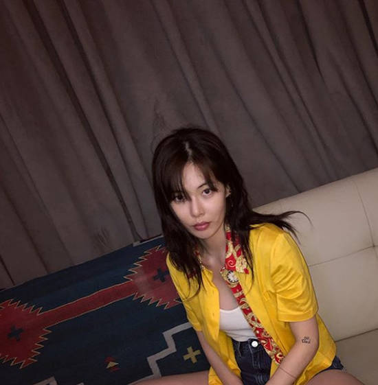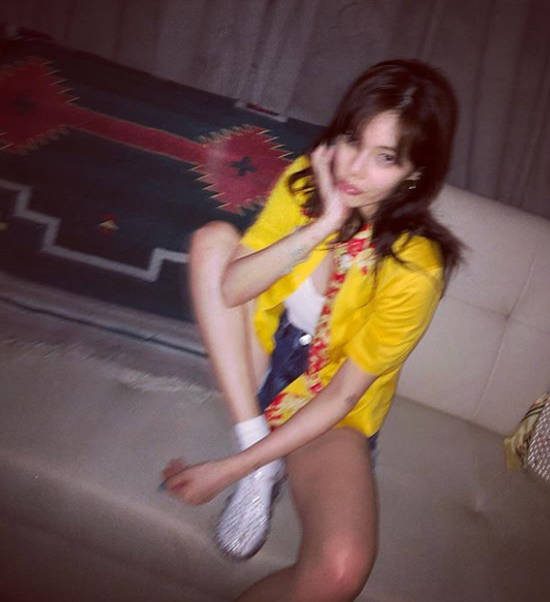 가수 현아는 얼마 전 자신의 인스타그램 계정에 여러 장의 사진을 게재하며 근황을 공개했다. 사진 속 현아는 화장기 없는 민낯으로 카메라를 응시하고 있다. 흰 티에 노란 셔츠, 핫팬츠를 매치한 현아는 앙상한 팔다리를 드러냈다.