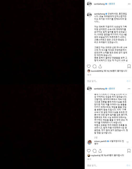 홍진영은 지난 23일 자신의 SNS에 "데뷔 후 지금까지 10년 넘게 가족처럼 생각했던 소속사와 계약 해지를 요구하는 법적 절차를 밟게 되었다. 이러한 결정을 하기까지 지난 4월부터 오늘날까지 하루하루가 너무나 고통스러웠고 많은 고민과 망설임 그리고 두려움이 있었다"라고 말문을 열었다.