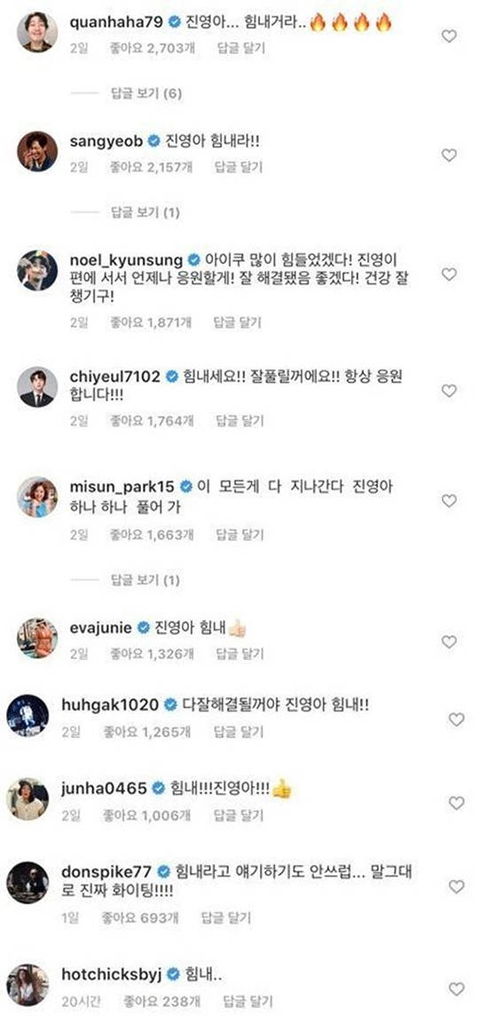 또한 황치열, 박미선, 돈스파이크, 허각, 정준하, 김준희, 배윤정도 "이 모든 게 다 지나간다"며 "홍진영 힘내길"라며 홍진영에 대한 의리를 보였다.