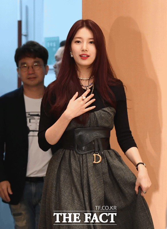이날 배수지는 검정 티셔츠에 튜브 톱 롱 드레스를 입고 등장해 눈길을 끌었습니다. 단정한 룩이었지만 밋밋해 보이지 않게 허리에 와이드 벨트로 포인트를 줘 가는 허리 라인을 강조했습니다.