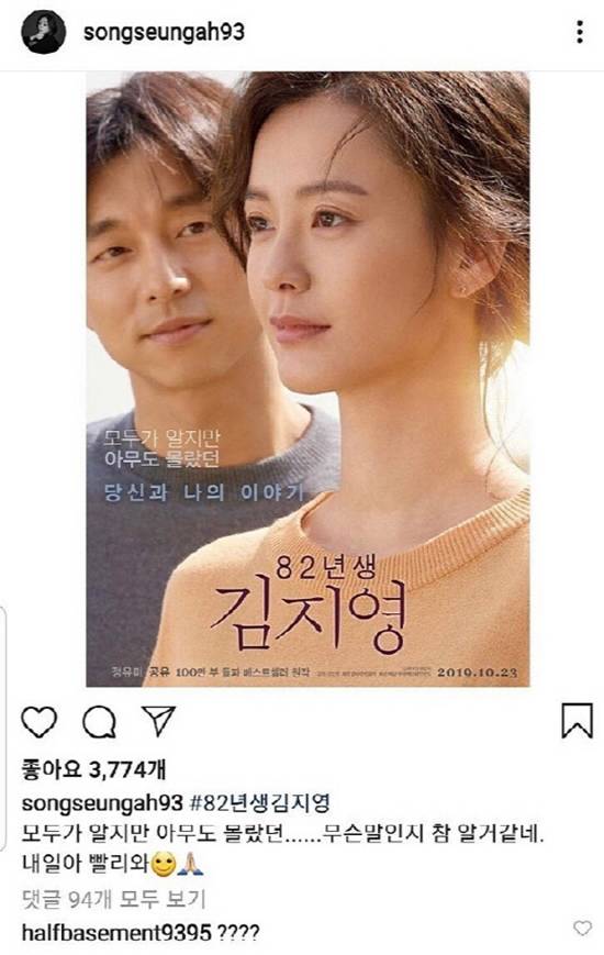 장범준의 아내 송승아는 지난 22일 자신의 인스타그램에 "#82년생 김지영 모두가 알지만 아무도 몰랐던. 무슨 말인지 참 알 거 같네. 내일아 빨리 와"라는 글과 함께 23일 개봉하는 '82년생 김지영' 포스터를 올렸다.