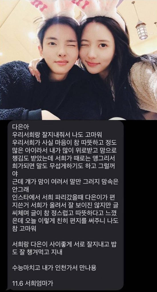 또한 정다은은 한서희 어머니에게 받은 문자 메시지를 공개했다. 정다은은 "서희야 우리 결혼하는 거야?"라는 글과 함께 한서희의 어머니에게 받은 문자 메시지를 캡처해 공개했다. 문자 메시지에서 한서희 어머니는 "다은아, 우리 서희랑 잘 지내줘서 나도 고마워. 서희가 때로는 앵그리 서희가 되면 말도 무섭게 하기도 하고 그럴 거야. 근데 걔가 마음이 여려서 말만 그러지 마음 속은 안 그래"라며 "서희랑 다은이 사이좋게 서로 잘 지내고 밥도 잘 챙겨 먹고 지내"라고 덧붙였다.