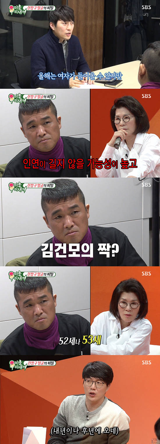 가수 김건모가 내년 1월 30대 피아니스트와 결혼 소식을 알린 가운데 과거 '결혼 관상'이 재조명되고 있다. 과거 방송된 SBS '미운 우리 새끼'에서 김건모는 관상가를 찾아가 자신의 연애운과 결혼운에 대해 물었다. 당시 관상가는 김건모에게 "눈 끝 부부궁이 홍색이어야 이는 가까운 시기에 좋은 인연을 만나거나 현재 연애운이 들어와 있다는 걸 말한다"라며 "김건모 씨의 부부궁을 보면, 아직 얼굴에 사랑이 안 왔다"라고 설명했다.