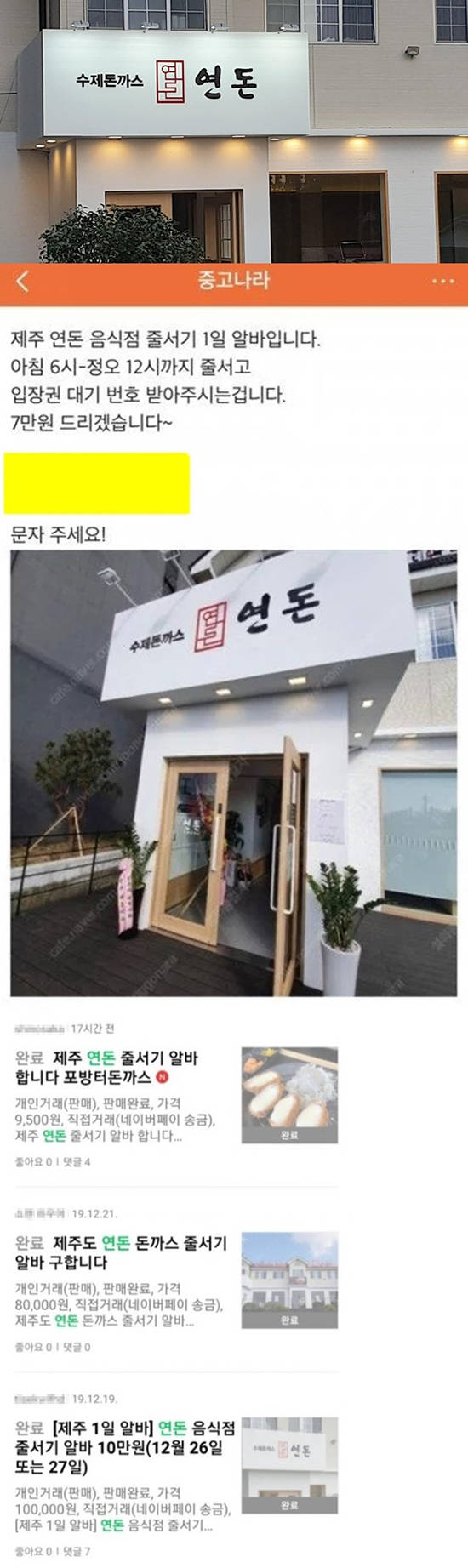 작성자는 "제주 연돈 음식점 줄서기 1일 알바다"며 "아침 6~12시까지 줄 서고 입장권 대기 번호를 받아주시면 된다. 7만원 드리겠다"고 밝혔다. 이들은 평균 오전 4시~6시 무렵부터 줄을 서 오전 10시~11시 무렵 자신과 교대하는 방식으로 현장에서 현금으로 비용을 지불하겠다고 설명했다. 하루 8시간 최저 일급은 66,800원으로 훨씬 높은 금액이다.