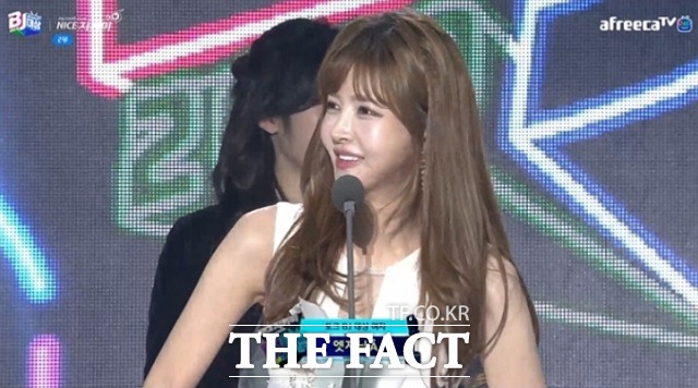 [더팩트ㅣ송은화 기자] BJ 엣지가 '아프리카TV BJ대상' 토크BJ 여자부분 대상을 수상하는 자리에서 가수 임창정에게 감사함을 전해 화제가 되고 있다. 이날 임창정은 꽃다발을 들고 무대에 오른 뒤 휴대전화로 엣지와 셀카를 찍는 등 재치있는 모습으로 이목을 끌기도 했다.