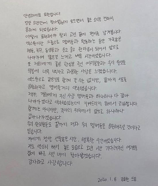 한편 김요한은 엑스원 해체 후 자신의 SNS 자필편지 게재해 눈길을 끌었다. 자필편지에서 김요한은 "저도 열심히 해서 좋은 모습으로 오랜 시간 기다려준 여러분들 곁에 빠른 시일 내에 찾아뵙겠다"고 말해 활동에 대한 기대감을 높이고 있다.