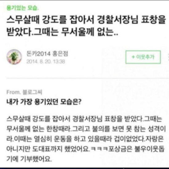 당시 김응서 사장은 게시물을 업로드 한 블로그를 통해 "스무 살 때 강도를 잡아서 경찰서장님 표창을 받았다"라며 "그때는 무서울 게 없는 한창때라 그리고 불의를 보면 못 참는 성격이라. 이때는 열심히 운동을 하고 있을 때라 겁이 없었다"고 지난 일을 회상했다. 이어 김응서 사장은 "자랑은 아니지만 도 대표까지 했다. 포상금은 불우이웃돕기에 기부했다"라고 은근한 자랑을 해 웃음을 자아냈다. 이를 접한 네티즌들은 "사실인가요?", "얼굴 표정이 골골해 보이셨는데 은둔 고수였네", "찾아낸 것도 대단해요 다양한 반응을 보였다.