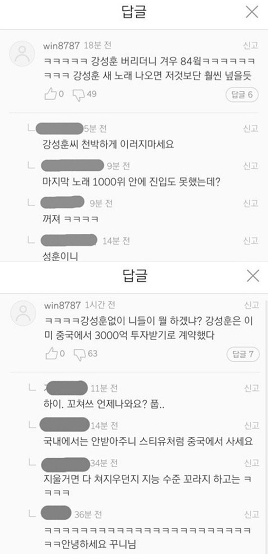온라인 커뮤니티에서는 '젝스키스 탈퇴한 강성훈 근황'이라는 제목의 글이 게재됐다. 글에는 닉네임 'winwin8787'이라는 누리꾼이 "강성훈 버리더니 겨우 84위를 기록했냐. 강성훈 새 노래 나오면 저것보단 훨씬 높을 듯", "강성훈 없이 니들이 뭘 하겠냐? 강성훈은 이미 중국에서 3000억 투자받기로 계약했다" 등의 댓글을 지난 28일 컴백한 젝스키스에게 남긴 내용의 댓글이다. 이에 네티즌들은 강성훈이 젝스키스에게 악플을 남긴 것이 아니냐며 "강성훈 씨 천박하게 이러지 마세요", "성훈이니?", "안녕하세요. 꾸니님"등의 비꼬는 듯한 댓글을 달았다.