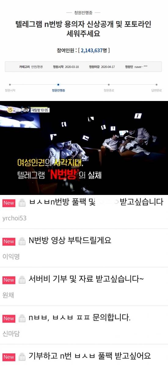 지난 18일에 올라온 '텔레그램 n번방 신상 공개 및 포토라인 세워주세요' 청원은 23일 오전 6시 30분 기준 214만 3637명의 동의를 받았다. 이는 역대 최다 인원의 동의를 받은 것으로, 또한 'n 번 방 가입자 전원의 신상을 공개하라'라는 청원도 150만 명을 돌파한 상태다.