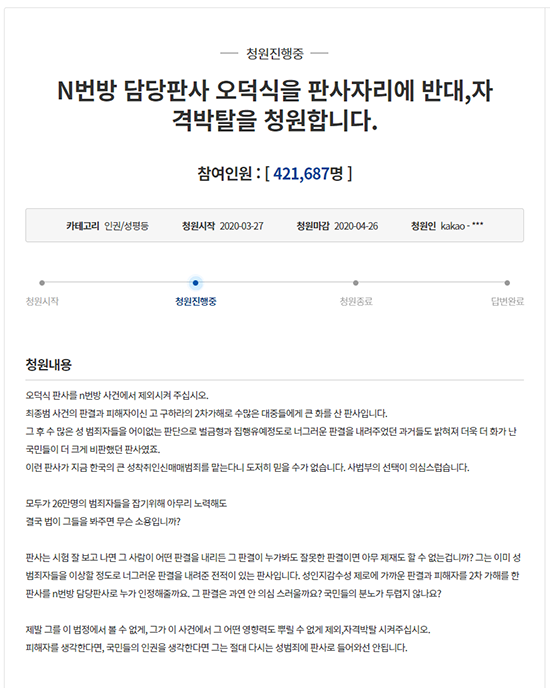 현재 날짜(31일) 'N번방 담당판사 오덕식을 판사 자리에 반대, 자격 박탈을 청원합니다'의 청원이 40만 명을 돌파하자 부담을 느낀 오 판사가 스스로 재배당을 요청한 것으로 보인다. 이 청원이 주목받는 이유는 특정 형사사건의 담당 판사를 교체해달라는 법원 외부 청원으로, 담당 판사가 교체된 경우는 매우 이례적이기 때문이다.