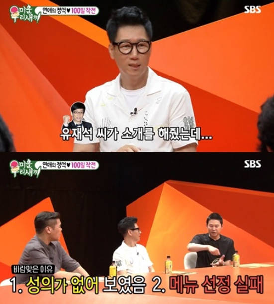 앞서 지석진은 SBS '미운우리새끼' 게스트로 출연해 아내와의 러브스토리를 전한 바 있다. 당시 그는 "처음에 소개받고 두 번째 만날 때 약속을 했는데 바람을 맞았다. 아내는 처음 만난 뒤 내가 싫었던 거다. 유재석 씨가 소개해줬는데 전날 유재석 씨 집에서 잤다. 옷도 꾀죄죄하고 모자 눌러쓰고 청바지에 티셔츠 입고 나갔다. 그런 모습이 성의가 없어 보였다고 하더라"고 입을 열었다.