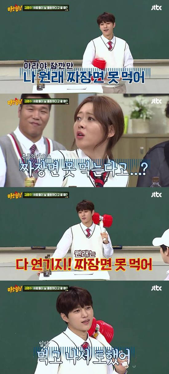 과거 JTBC '아는형님'에는 김명수와 고아라가 전학생으로 출연했다. 이날 방송에서 이수근이 김명수에 대해 "우리 다 먹을 수 있는 짜장면을 못 먹을 수도 있다"고 밝히자 고아라는 "아니다. 한 그릇 뚝딱 했다. 촬영할 때마다 항상 다 먹었다"고 대답했다. 하지만 김명수는 "원래 짜장면 못 먹는다"고 밝혀 놀라움을 자아냈다.