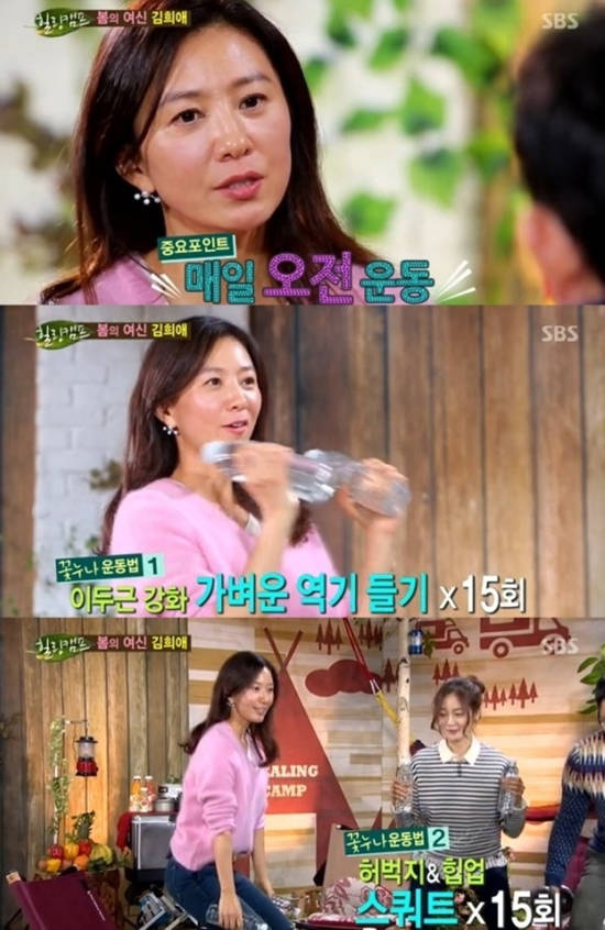 그녀는 이어 "앉았다 일어났다 그것도 하고, 런지라고 발 바꾸는 것도 한다. 시간을 최대한 줄이는 방법으로 한다"라며 자신만의 운동법을 말했다. 또 김희애는 물이 든 물병을 이용해 스쿼트, 런지 등을 시범 보이며 "이러면 5분에서 10분밖에 안 걸린다. 운동을 멈출 거면 아예 안 한다. 할 거면 매일 한다"고 덧붙였다.