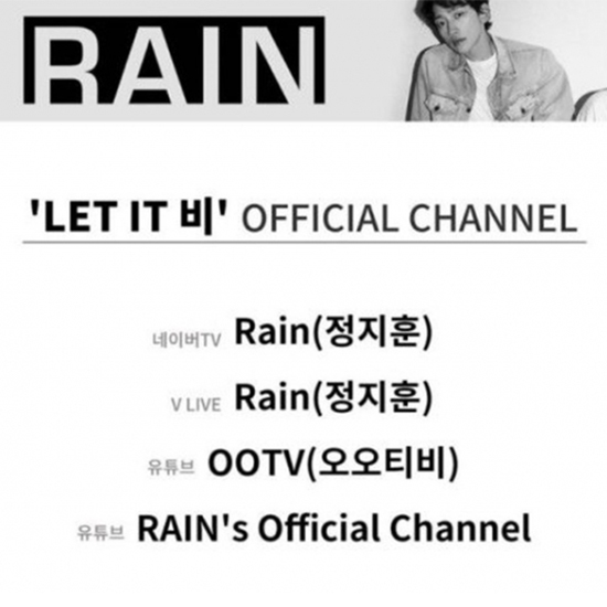 또한 소속사 측은 "공식 채널은 아래와 같다"며 "네이버TV _ Rain(정지훈), V LIVE _ Rain(정지훈), 유튜브 OOTV(오오티비), 유튜브 RAIN's Official Channel"이라고 덧붙였다.