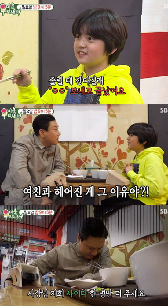 김강훈은 "내가 '몇 시에 잘 거냐'고 물어봤다. 여자친구가 '졸릴 때 잔다'라고 얘기하길래 'ㅇㅇ'라고 답장을 보냈다. 그리고 헤어졌다"고 다소 황당한 이별 사유를 공개했다. 이에 이상민은 분노하며 "넌 지금 떡볶이가 넘어가냐"고 물으며 속이 상한 듯 "사장님 저희 사이다 한 병만 더 주세요"라고 말해 현장을 폭소케 했다.