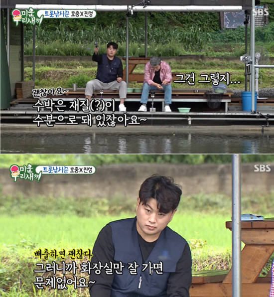 김호중은 "다이어트는 심리전인 것 같다. 정신 싸움에서 져 버리면 안 되더라. 먹을 때도 철학이 있다. 먹고 바로바로 배출하면 괜찮다. 먹는 걸 두려워해서는 안 된다. 그래서 간헐적 단식을 한다. 저녁 6시 전까지는 먹을 수 있다. 어제는 수박 한 통 반 먹었다. 수박도 수분이니까 화장실만 잘 가면 문제 없다"고 기적의 논리를 내세웠다.