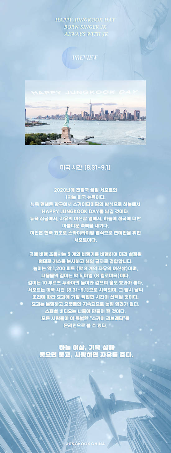 또한 중국 팬들은 정국을 위해 '스카이 러브레터' 이벤트를 준비했다고 밝혔다. 비행기 5대는 뉴욕 자유의 여신상 옆에서 하늘에 'HAPPY JUNGKOOK DAY'를 가스로 분사해 글자를 만든다. 총 8km의 길이로 한국 최초 스카이 타이핑 형식 연예인 서포트다.