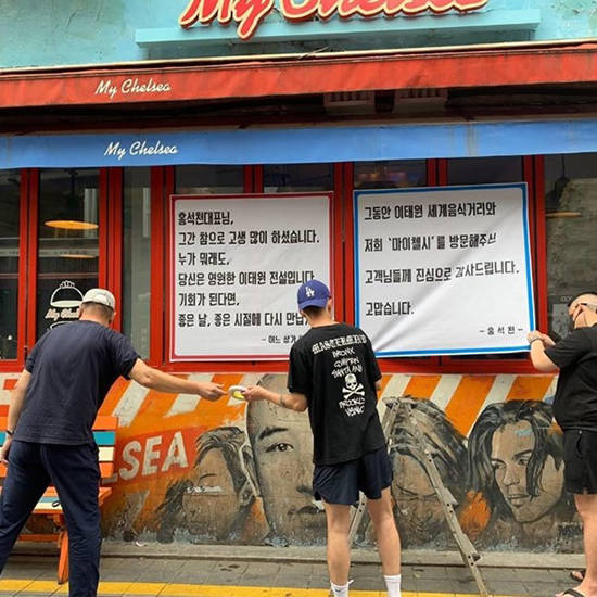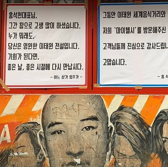 지난달 31일 홍석천은 자신의 인스타그램에 "눈물 납니다. 정말 감사합니다"라는 글과 함께 사진 3장을 게재했다. 공개된 사진 속엔 이태원 상인들이 영업을 종료한 홍석천 가게에 현수막을 거는 모습이 담겼다.