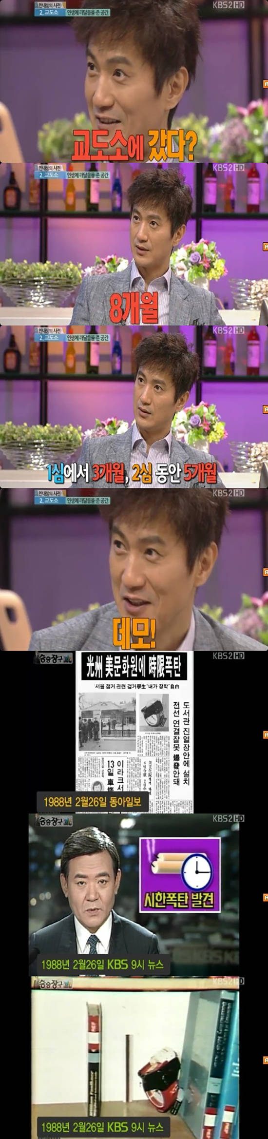 이어 "폭탄을 만들어 미국문화원에 던졌다. 다행히 터지진 않았지만 교도소에 가게 되었다. 나도 그 사건으로 1면에 나올지 몰랐는데 아버지께서 자식이 신문에 나오고 방송도 탔다고 좋아하더라"고 말해 모두를 폭소케 하기도 했다.