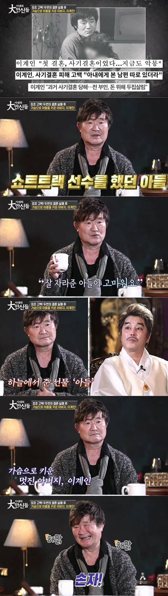 이어 이계인은 입양한 아들에 대해 언급하기도 했다. 이계인은 입양한 아들이 두 번째 전처의 자식임을 밝히며 "아들과 나는 '찹쌀떡 인연'이라는 생각이 들었다"며 "내가 같이 살면서 키웠다고 봐야 한다"고 말했다. 그러면서 "아들이 유치원생이던 시절 '내가 얘를 버리면 어떻게 성장이 가능할까'라고 생각했다. 고민 끝에 버리지 않겠다고 다짐했다"며 "세상 누구 못지않게 잘 키웠다고 자부한다. 쇼트트랙 선수였는데, 열심히 사는 걸 보니까 우리 아들이 잘 자라준 게 너무 고맙다"며 애틋한 마음을 전했다.
