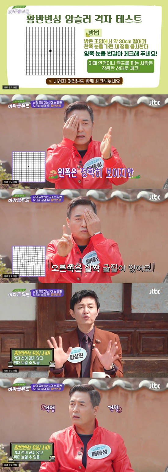 이에 안과 전문의 임상진은 "집에서 간단하게 황반변성 자가검진법이 있다"라고 설명했다. 그는 "암슬러 격자 테스트다. 밝은 조명에서 약 30cm 떨어져 한쪽 눈을 가린 채 점을 응시한다. 이 상태에서 주의가 직선으로 보이는 지, 곡선으로 보이는 지 확인하는 것이다"라고 설명했다. "이 때 안경이나 렌즈를 끼는 사람은 착용한 상태로 체크해야한다"라고 덧붙였다.