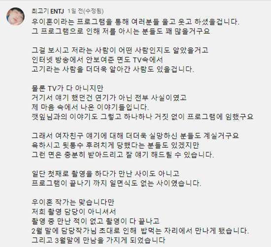 이어 그는 "'우이혼' 작가는 맞습니다만 저희 촬영 담당이 아니셔서 촬영 중 만난 적이 없고 촬영이 다 끝나고 2월 말에 담당작가님 초대로 인해 밥 먹는 자리에서 만나게 됐다"라며 "그리고 3월 말에 만남을 갖게 됐다"라고 설명했다. 끝으로 최고기는 "일반인인 여자친구와 솔잎이가 상처받지 않게 무분별한 악플은 자제하셨으면 하고, 아직 고소 진행은 하지 않았지만 증거는 다 수집 중에 있으니 무분별한 악플은 선처 없이 고소하겠다"라고 경고의 목소리를 내기도 했다.