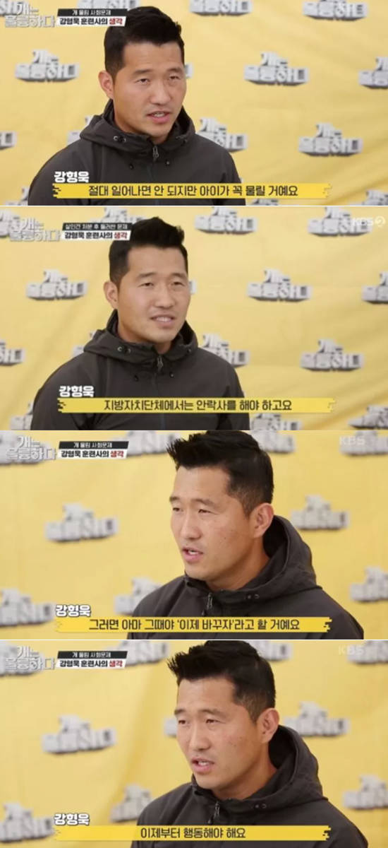 그러면서 강형욱은 "사람의 도움을 거부하는 개들과 우리가 공존할 수 있는지 고민해봐야 하고, 그 개들을 그대로 두지 말고 사람이 만든 구성원 안에 들여야 한다고 생각한다"라고 말했다. 이어 그는 "분명히 모든 나라에서 법이 바뀌고 모든 나라에서 확실한 행동을 취하는 것은 아이가 사망했을 때"라며 "아이가 사망할 수도 있다. 그때서야 이제 바꾸자고 할 것"이라며 뒤늦은 대처에 대해 우려하는 모습도 보였다.