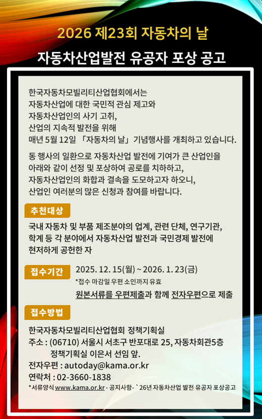 최종 수상자는 2026년 5월 12일 개최 예정인 '제23회 자동차의 날 기념식'에서 포상을 수여받게 된다.