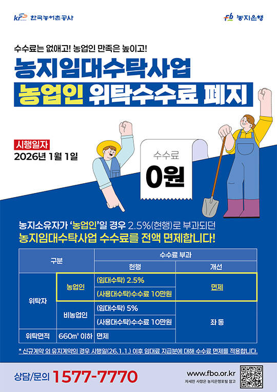 이번 개편으로 위탁자가 농업인인 경우 농지임대수탁 수수료는 전액 면제된다. 시행일 이후 체결되는 신규 계약뿐 아니라 현재 계약을 유지 중인 농업인에게도 내년 1월1일 이후 부과되는 수수료부터 동일하게 면제 혜택을 적용한다.