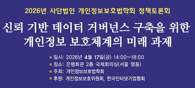 [더팩트 | 박순규 기자] 사단법인 개인정보보호법학회(회장 김도승)가 오는 4월 17일 오후 2시 서울 은행회관에서 ‘신뢰 기반 데이터 거버넌스 구축을 위한 개인정보 보호체계의 미래과제’ 정책토론회를 개최한다. 이번 토론회는 AI와 데이터가 국가 산업의 핵심 동력이 된 2026년 현재, 지속 가능한 IT 생태계를 위한 ‘신뢰’의 가치를 재조명하기 위해 마련됐다.