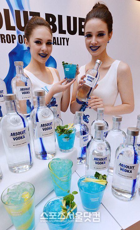 [문병희 기자] 20일 오전 서울 소공동 롯데호텔에서 열린 2013 앱솔루트 보드카 리미티드 에디션 ‘앱솔루트 블루’ 출시 기념행사에서 ‘블루’ 메이크업을 한 모델들이 제품을 소개하고 있다. 이번 에디션은 앱솔루트 아이코딕 바틀의 고급스러운 외양에 시그니처 컬러인 코발트 블루 한 방울을 자연스럽게 흐르도록 함으로써 앱솔루트 오리지널 컬러인 ‘블루’를 부각시켰으며 4백만 개의 병이 각자 다른 디자인을 하고 있다.