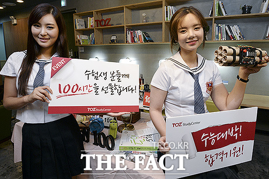 [더팩트ㅣ최진석 기자]수능을 100일 앞둔 5일 오전 서울 서초구 토즈 스터디센터 반포 R&D에서 열린 '수능 D-100, 토즈 스터디센터 100시간 증정 이벤트' 행사에서 모델들이 포즈를 취하고 있다.