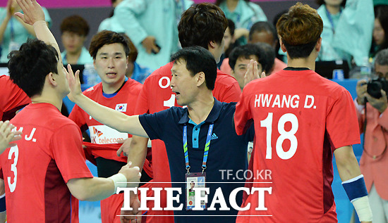 [더팩트│선학핸드볼경기장=임영무 기자]29일 오후 인천 선학핸드볼경기장에서 열린'2014 인천 아시안게임' 핸드볼 남자 한국과 바레인의 준결승에서 27:23으로 승리한 한국의 김태훈 감독이 선수들을 격려하고 있다.