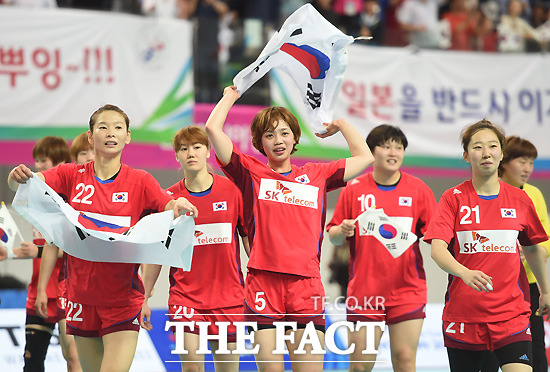 [더팩트|선학핸드볼경기장=최용민 기자]1일 오후 인천 선학핸드볼경기장에서 열린 '2014 인천 아시안게임' 여자 핸드볼 결승전 한국과 일본의 경기에서 한국이 29-19로 일본을 누르고 금메달 차지하자 태극기 세리머니를 펼치고 있다.