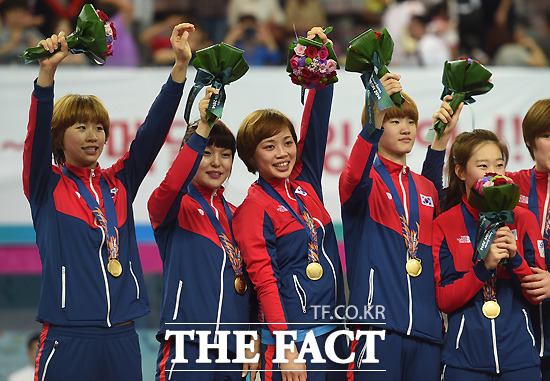 [더팩트|선학핸드볼경기장=최용민 기자]1일 오후 인천 선학핸드볼경기장에서 열린 '2014 인천 아시안게임' 여자 핸드볼 결승전 한국과 일본의 경기에서 한국이 29-19로 일본을 누르고 금메달 차지했다. 시상대 가장 높은 곳에서 환호하는 팬들에게 답례하는 한국 대표팀.