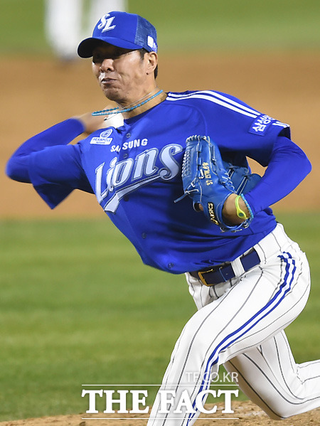 [더팩트|잠실야구장=최용민 기자]11일 오후 서울 잠실야구장에서 열린 2014 프로야구 한국시리즈 6차전 삼성 라이온즈와 넥센 히어로즈의 경기에서 11-1로 크게 앞선 9회말 삼성 마무리 임창용이 역투를 하고 있다.