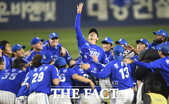 [더팩트|잠실야구장=최용민 기자]11일 오후 서울 잠실야구장에서 열린 2014 프로야구 한국시리즈 6차전 삼성 라이온즈와 넥센 히어로즈의 경기에서 넥센을 11-1로 누르고 시리즈 전적 4승 2패로 4년 연속 한국시리즈 통합 우승을 일궈낸 삼성 선수들이 그라운드에서 세리머니를 하고 있다. 삼성 마무리 임창용이 4년 연속 통합 우승을 상징하는 손가락 4개를 들어 보이고 있다.