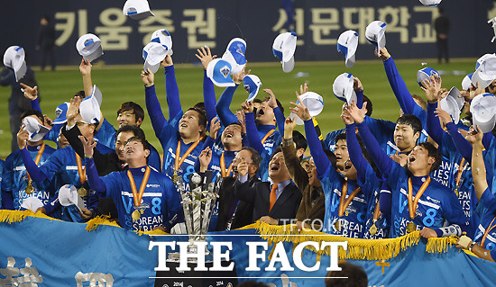 [더팩트|잠실야구장=최용민 기자]11일 오후 서울 잠실야구장에서 열린 2014 프로야구 한국시리즈 6차전 삼성 라이온즈와 넥센 히어로즈의 경기에서 삼성이 넥센을 11-1로 누르고 시리즈 전적 4승 2패로 4년 연속 한국시리즈 통합 우승을 달성했다. 우승기를 전달 받은 삼성선수들과 관계자들이 모자를 던지며 세리머리를 하고 있다.