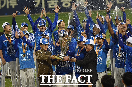 [더팩트|잠실야구장=최용민 기자]11일 오후 서울 잠실야구장에서 열린 2014 프로야구 한국시리즈 6차전 삼성 라이온즈와 넥센 히어로즈의 경기에서 삼성이 넥센을 11-1로 누르고 시리즈 전적 4승 2패로 4년 연속 한국시리즈 통합 우승을 달성했다. 삼성이 한국시리즈 우승트로피를 전달 받고 환호하고 있다.