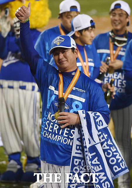 [더팩트|잠실야구장=최용민 기자]11일 오후 서울 잠실야구장에서 열린 2014 프로야구 한국시리즈 6차전 삼성 라이온즈와 넥센 히어로즈의 경기에서 삼성이 넥센을 11-1로 누르고 시리즈 전적 4승 2패로 4년 연속 한국시리즈 통합 우승을 달성했다. 최우수 감독으로 선정된 류중일 감독이 엄지손가락을 치켜들고 있다.