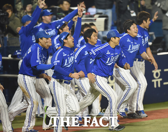 [더팩트|잠실야구장=최용민 기자]11일 오후 서울 잠실야구장에서 열린 2014 프로야구 한국시리즈 6차전 삼성 라이온즈와 넥센 히어로즈의 경기에서 삼성이 넥센을 11-1로 누르고 시리즈 전적 4승 2패로 4년 연속 한국시리즈 통합 우승을 달성했다. 우승이 확정되자 삼성 선수들이 그라운드로 달려가고 있다.