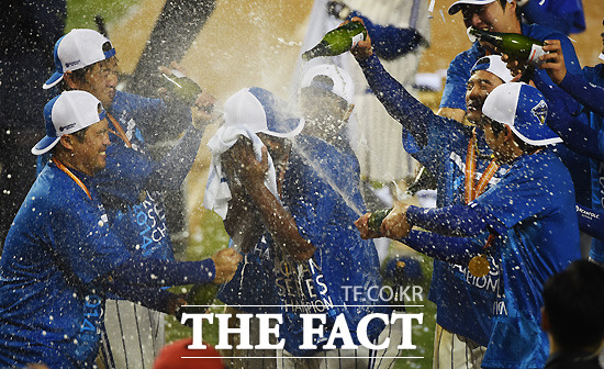 [더팩트|잠실야구장=최용민 기자]11일 오후 서울 잠실야구장에서 열린 2014 프로야구 한국시리즈 6차전 삼성 라이온즈와 넥센 히어로즈의 경기에서 삼성이 넥센을 11-1로 누르고 시리즈 전적 4승 2패로 4년 연속 한국시리즈 통합 우승을 달성했다. 한국시리즈 MVP로 선정된 나바로가 샴페인 세례를 받고 있다.