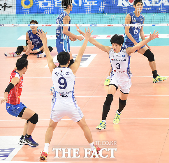 [더팩트|계양체육관=최용민 기자]1일 오후 인천시 계양체육관에서 열린 'NH농협 2014-2015 남자프로배구 V리그' 대한항공과 삼성화재의 경기에서 듀스 끝에 27-25로 1세트를 먼저 따내며 기선을 제압한 대한항공 선수들이 환호하며 기뻐하고 있다'