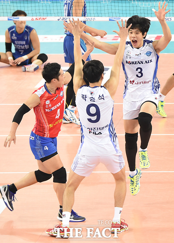 [더팩트|계양체육관=최용민 기자]1일 오후 인천시 계양체육관에서 열린 'NH농협 2014-2015 남자프로배구 V리그' 대한항공과 삼성화재의 경기에서 듀스 끝에 27-25로 1세트를 먼저 따내며 기선을 제압한 대한항공 선수들이 환호하며 기뻐하고 있다'